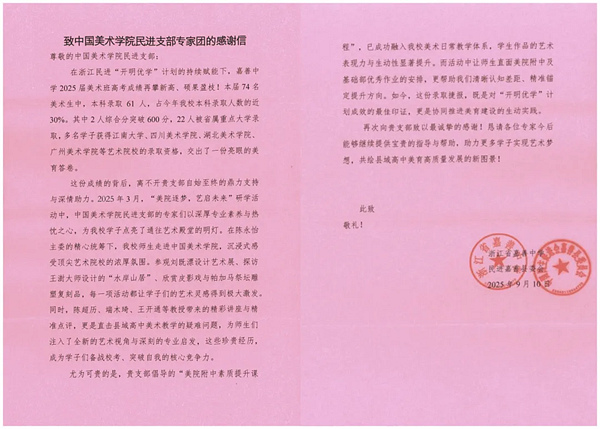 近日,浙江省嘉善中學(xué)向民進(jìn)中國(guó)美術(shù)學(xué)院支部發(fā)來(lái)感謝信,誠(chéng)摯感謝支部專(zhuān)家團(tuán)對(duì)學(xué)校藝術(shù)教育高質(zhì)量發(fā)展所提供的大力支持。這封信不僅表達(dá)了真誠(chéng)的謝意,更折射出我校民進(jìn)支部與嘉善中學(xué)自2023年11月結(jié)對(duì)共建以來(lái)所取得的實(shí)質(zhì)性成果。